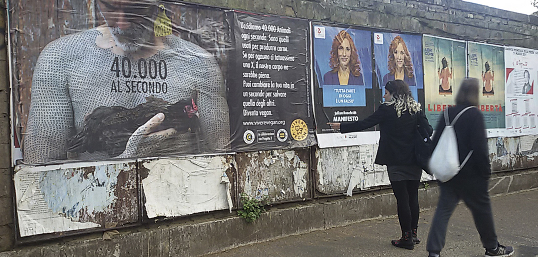 Dall’8 al 17 marzo 2019 hanno campeggiato nelle vie di Roma i 30 grandi manifesti (delle dimensioni di 3 ×1,40 metri) della pubblicità antispecista “40.000 al secondo”.
