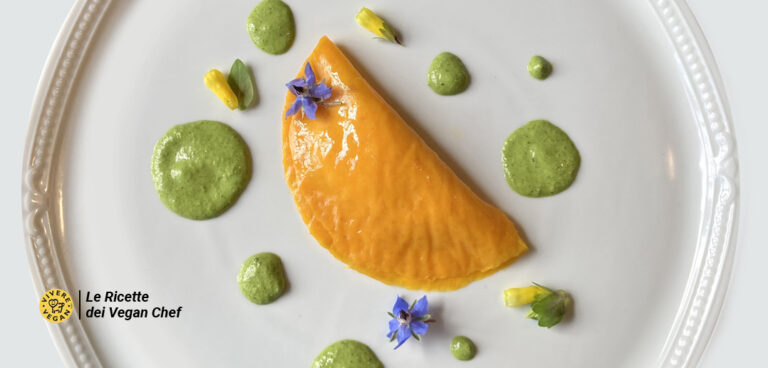 In contrasto con l’arancio intenso del raviolo, la salsa verde e qualche fiore di borragine e di cerinthe, che possiamo trovare in questo periodo, passeggiando in campagna.